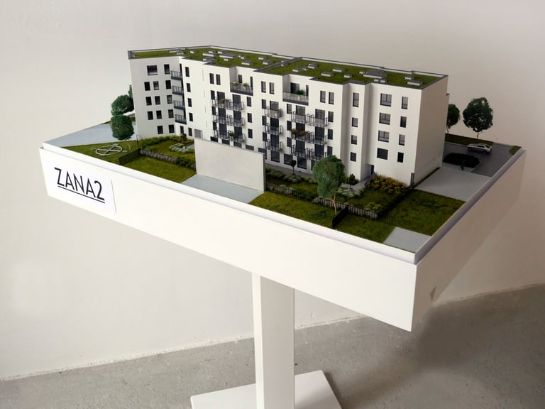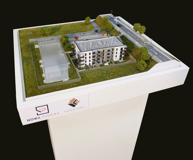 Do ekspozycji modelu proponujemy zarówno niestandardowe zabudowy meblowe, ramy, jak i bardziej klasyczne prostopadłościenne kubatury, czy nogi montowane do bazy makiety.